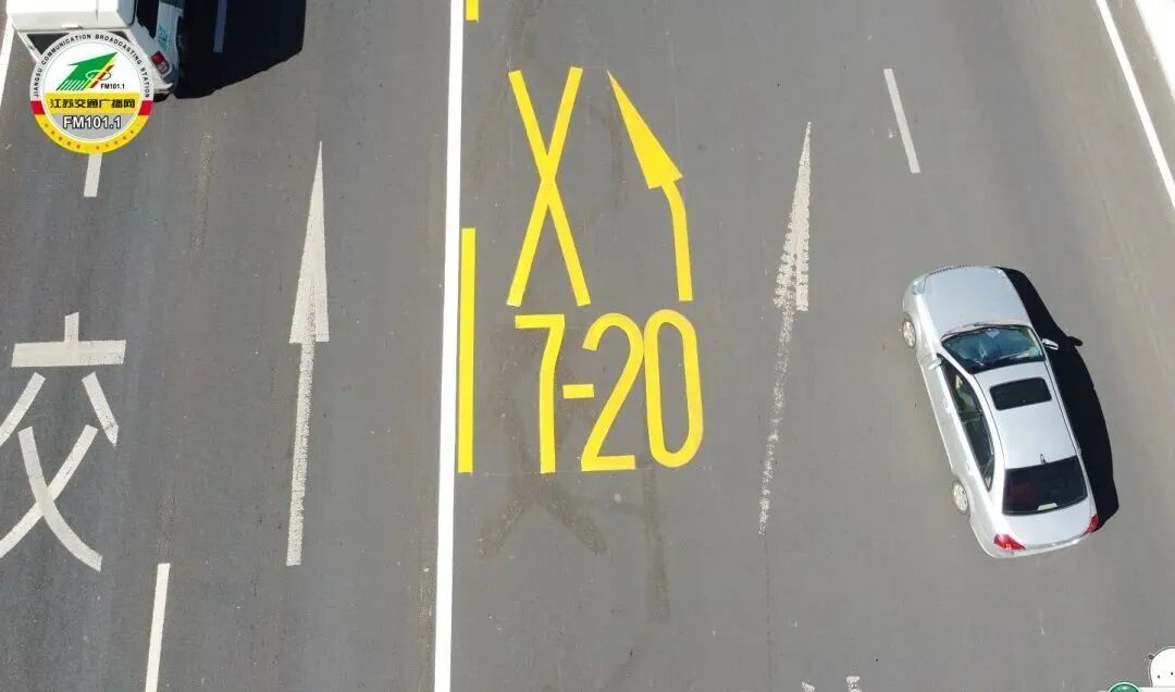 时段性禁止标线左侧为白色实线,右侧为黄色虚线,标记时段以及禁止变道标识。